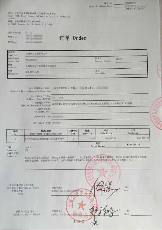 上海汽車集團股份有限公司商用車技術中心向上海眾有實業有限公司下采購訂單